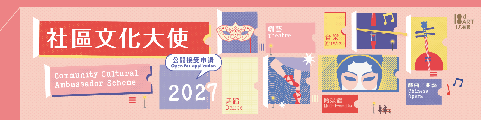 康樂及文化事務署(「署方」)現正接受2027年度「社區文化大使計劃」的申請,贊助本地藝團及藝術工作者透過藝術外展活動,將表演藝術帶進社區。